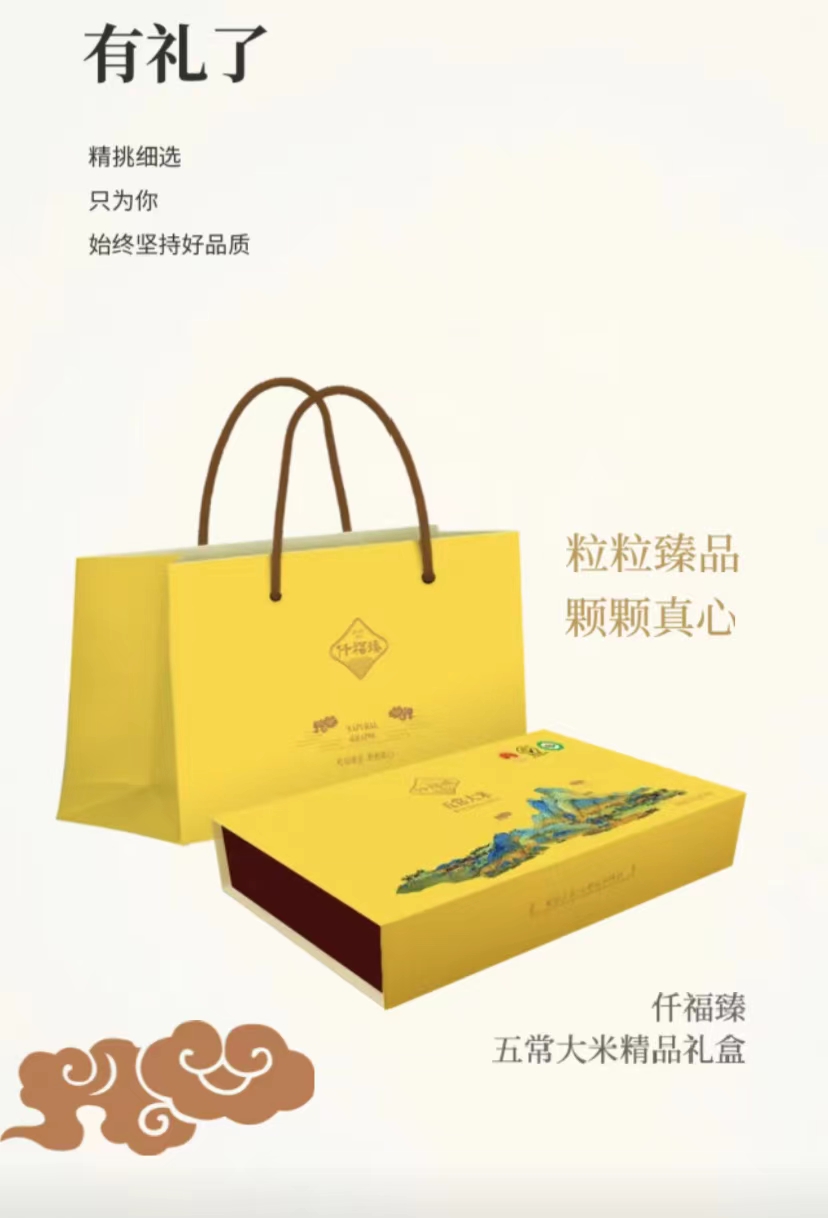 “仟福臻”现如今产品主打粮食礼盒,包括大米礼盒与杂粮礼盒,每一粒米都是经过精心挑选和精心加工的米中佳品,每一颗粮食都凝聚着劳动者辛勤的劳作和真心的付出。设计简约高端,是走亲访友、商务馈赠的上品之选。